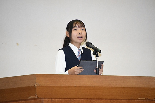 10月22日(水)、体育館に全校生徒が集まり、生徒会の新しい役員を決める立会演説会が行われました。 今回は、生徒会長候補2名、生徒副会長候補3名が立候補し、それぞれが「学校をもっと良くしたい」という思いを込めて、公約や目標を発表しました。