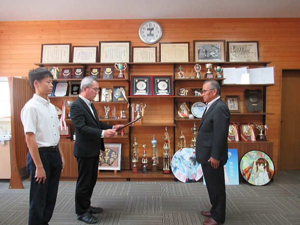 本校生徒に対して「今回の寄附を活用して新しい部室を整備し、よい環境で部活動も頑張ってほしい。」とのお言葉をいただきました。