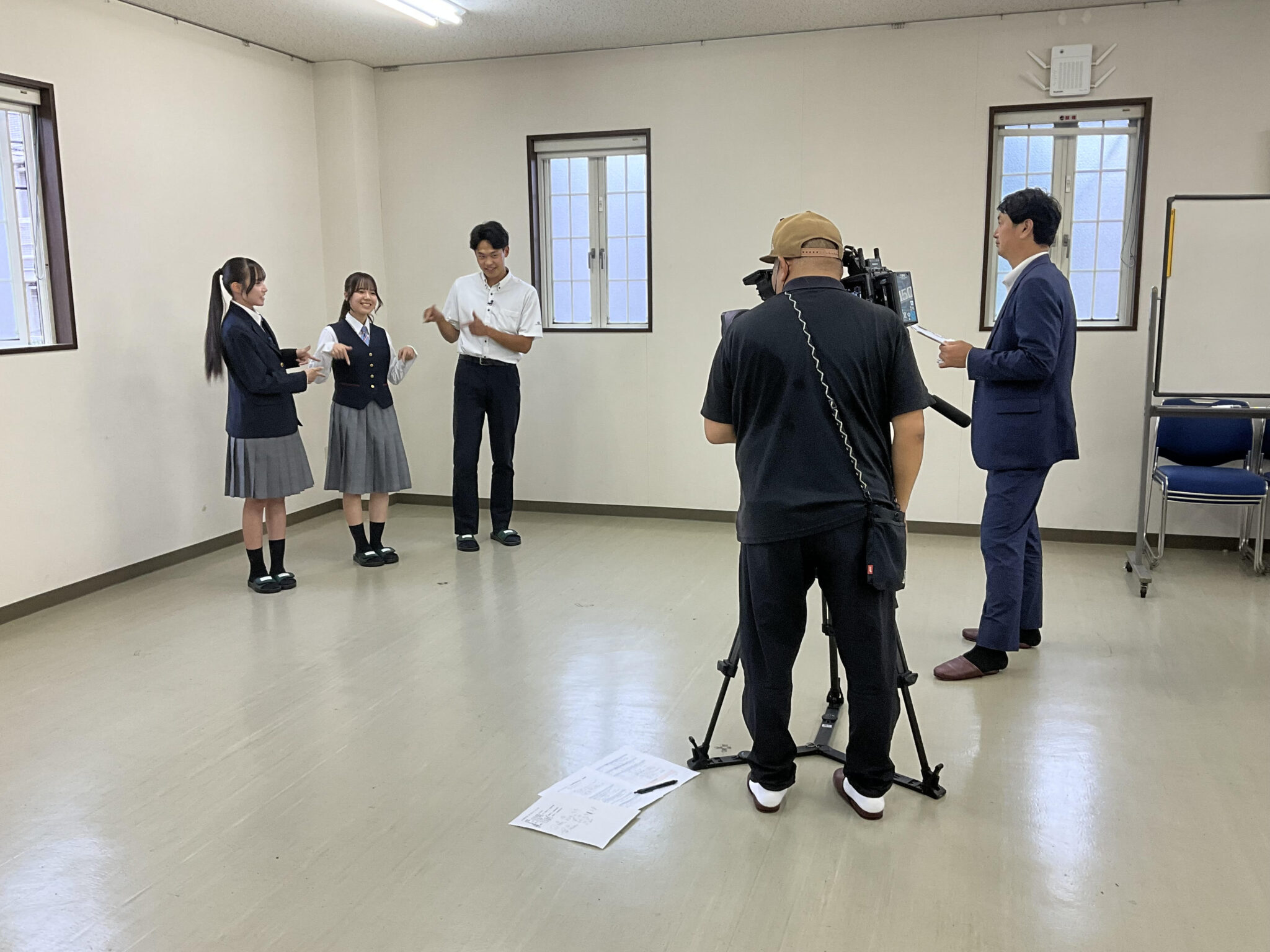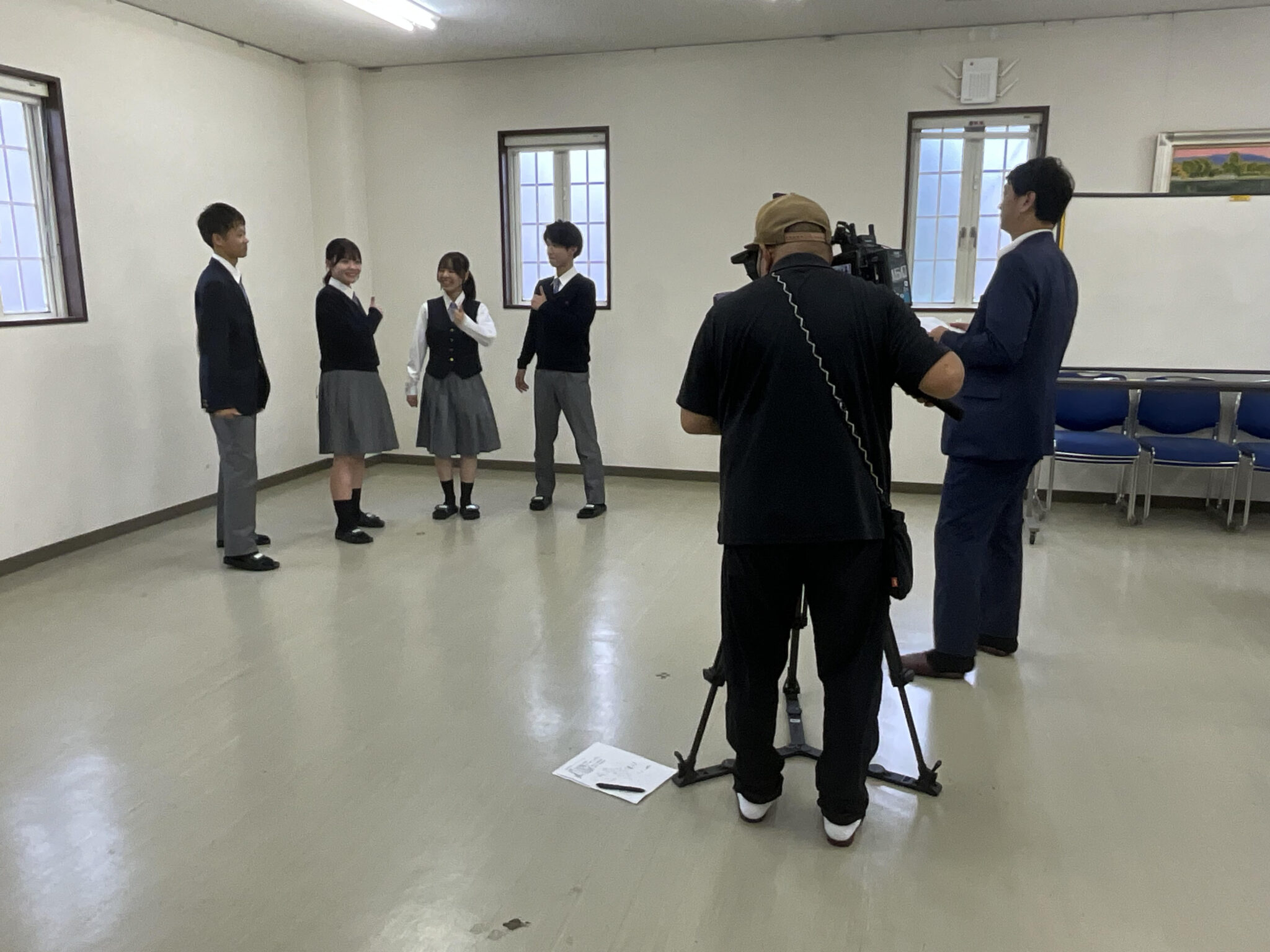 10月16日 本校の制服を制作していただいている株式会社トンボ様の協力で3分のTV出演が叶いました。 生徒たちはカメラが回るとどうしても緊張して,普段どおりに話すことができなく,何度もNGを出してしまったシーンもありましたが,なんとか撮り終えることができました。