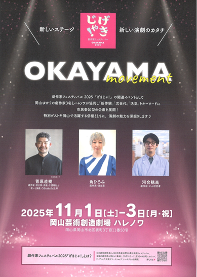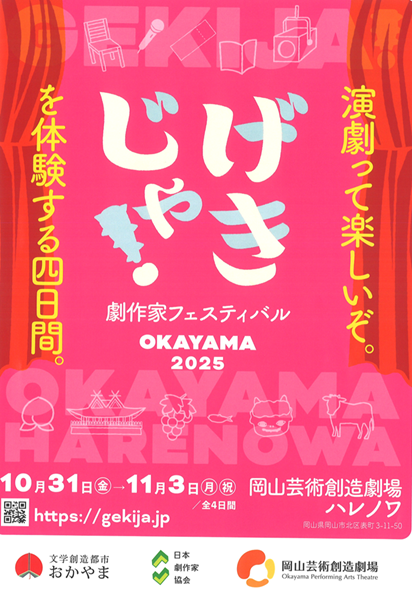 令和7年10月31日(金)~3日(月・祝)に岡山芸術創造劇場ハレノワにて、劇作家フェスティバル2025「げきじゃ!」が開催されます。