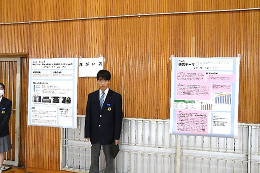各グループより、2名の代表者がポスターセッション形式で2年生生徒、教員、来校者の方を対象に発表を行いました。これまで授業の中で学んできた「インクルージョン」「女性活躍推進・育児」などから各自興味のあるテーマを設定し探究を行い、発表者、聴講者ともに学びを深めることができました。