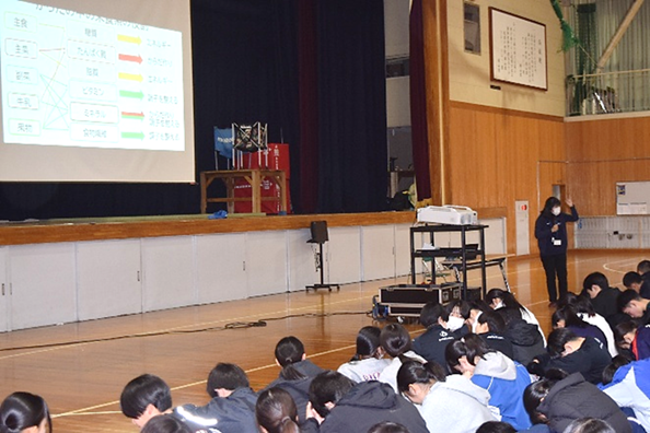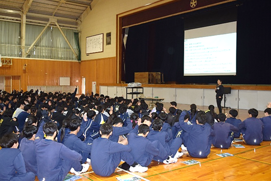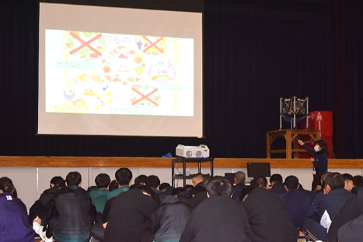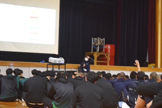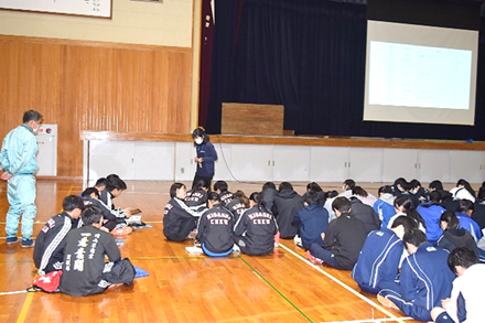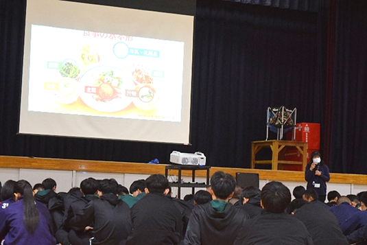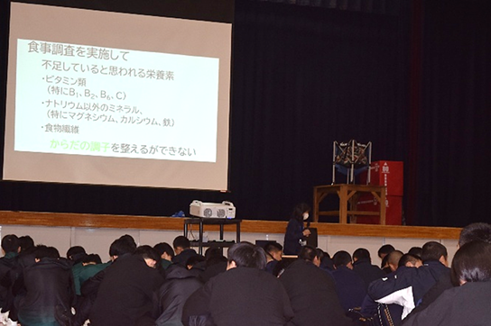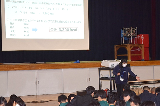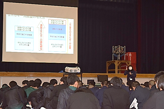 【1日目 午後】 真鍋芳江先生を講師にお迎えし「スポーツ栄養学 高校選手に必要な食べ方!」をテーマに、「欠食をしない。好き嫌いをしない。基本的な食事の形をそろえる。食事時間と内容を考える。」等、必要な栄養の摂り方について講義を受けました。トレーニングと食事の関係を学ぶことで、より効果的な身体づくりへの理解を深めることができました。