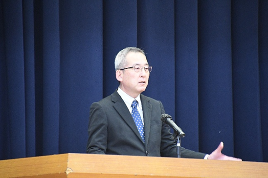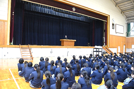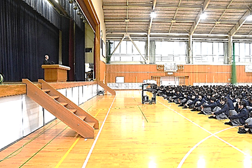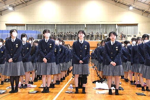 式辞の後、全校生徒で校歌を高らかに斉唱しました。 終業式の後、進路課・商業科・生徒課の各課長から生徒に向けて冬休みの過ごし方と3学期に向けての準備について話がありました。