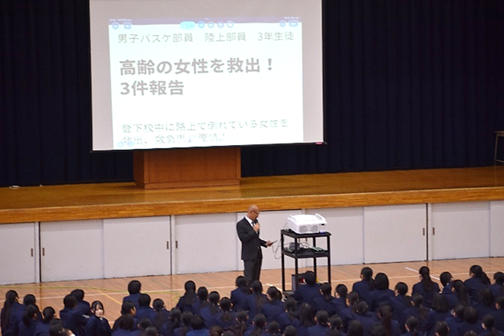 12月24日(水)、体育館で2学期の終業式を行いました。 校長先生は式辞の中で、「① 新年に向けて、自分の成長につながる高い目標をしっかり持つこと② 小さな勇気を出して、良い行いを積み重ねること③ 自転車の交通反則通告制度が導入されることについて」上記の3つのことをお話しされました。