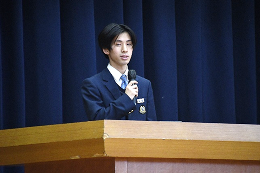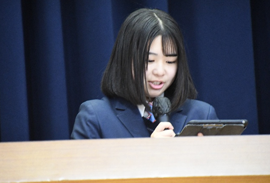 総会では、3年生の正金結海代表取締役社長をはじめ、取締役の生徒が各部署の活動実績の報告やアンケート結果の報告、部署ごとの反省点について発表しました。また、デパートの売上集計報告、決算報告、監査報告も行われました。