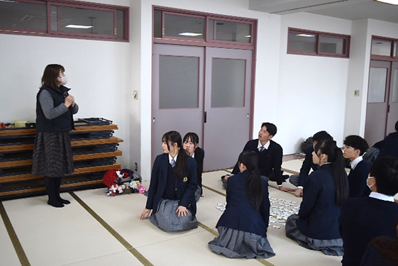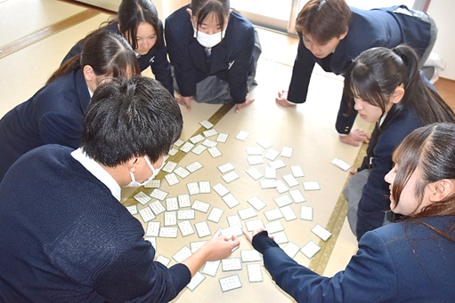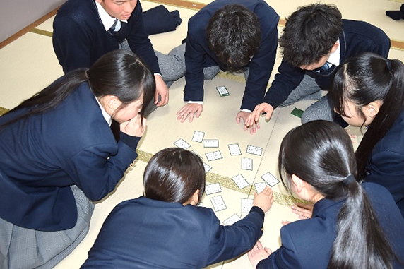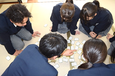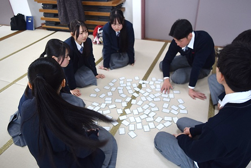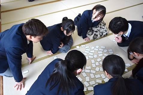 上の句が読まれると、生徒たちは一斉にかるたを探し始め、下の句が読まれる前に取る場面も見られ、笑顔でかるたを取る姿が印象的でした。