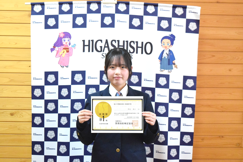 本校のビジネス創造科3年生、曽原祢々さんが実務技能検定協会主催の「第137回秘書技能検定 準1級」に見事合格しました。