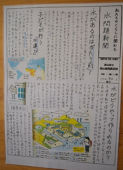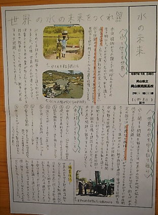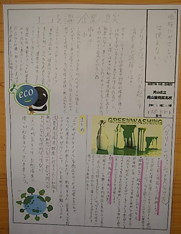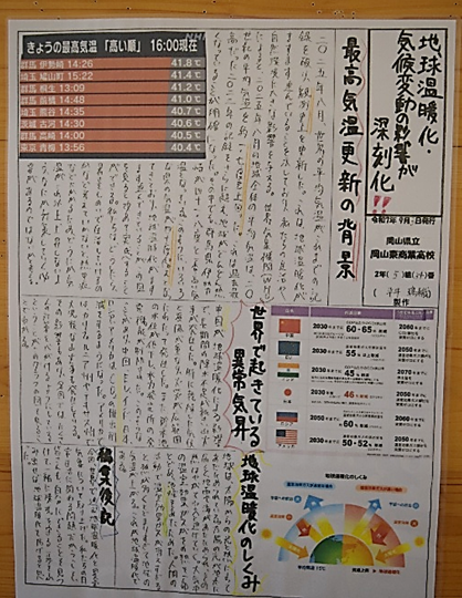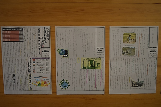今回の作品は、2年生の「家庭総合」の環境に関する授業の一環として制作したものです。生徒たちは、それぞれが興味・関心を持ったテーマについて調べ、新聞形式にまとめました。