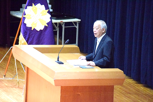 続いて、澤根育生同窓会長よりご挨拶をいただき、記念品の贈呈が行われました。