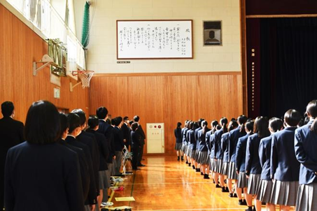 3月19日(金)、3学期終業式を生徒の間隔を十分に取り、体育館で行いました。