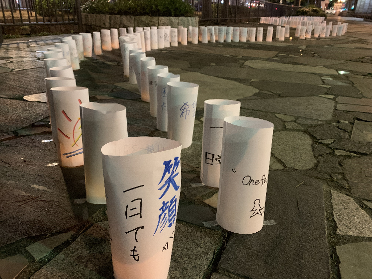 3月6日夜、西川緑道公園で「東北復興【FUKU-O】キャンドルナイト」が行われ、本校1・2年の全生徒(約640人)がLEDのキャンドルに巻く紙に、「当たり前の生活が戻りますように」「私たちは何年たっても忘れない」などの応援メッセージを書いて、東北復興への気持ちを届けました。