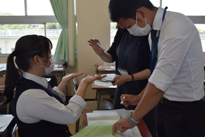5月28日(木)、2年生が登校し、健康観察記録表の点検やビジネスマナー意識向上のための身だしなみのチェックや学習時間の記録、そして、来週からの学校再開の連絡も行いました。